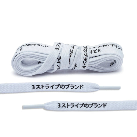 Lace Lab's White Japanese Katakana laces are the new craze in the sneaker world. The text reads "The brand with the 3 stripes" and goes great on most Adidas Boost Shoes. If you're shopping for Ultra Boost Laces, our 41" are the perfect length. For NMD_R1's, opt for our 30" lace length.